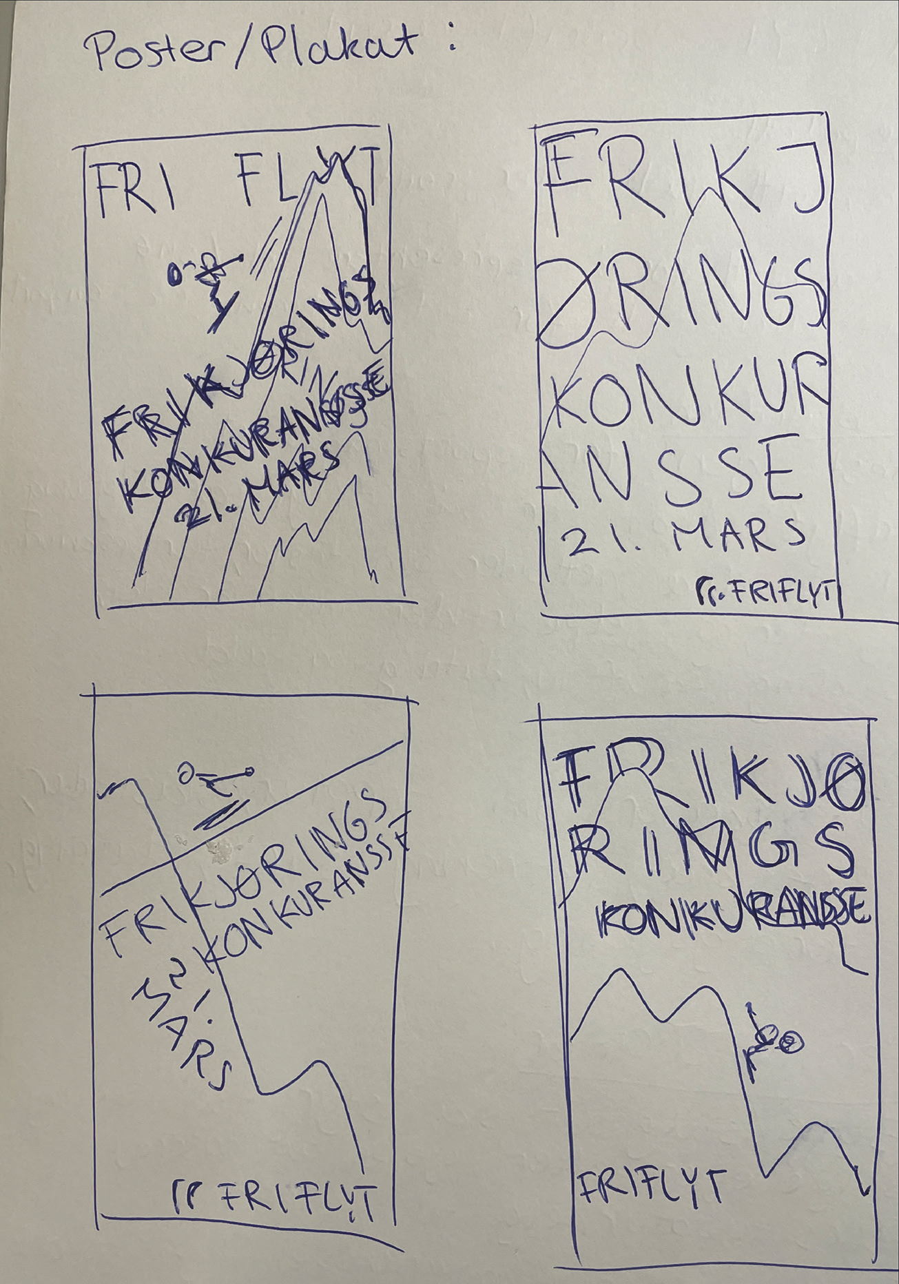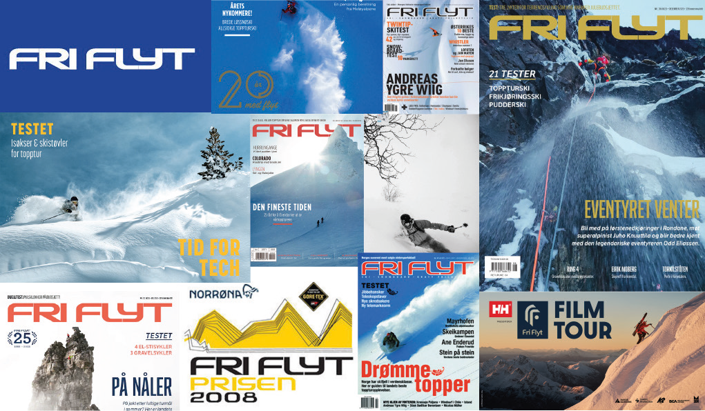Jeg brukte friflyt sin visuelle profil som grunnlag til å utvikle ideer videre. Jeg ønsket dynamikk i bildet, med fjell som hovedfokus, og valgte å integrere logoen Friflyt, som en del av designet.